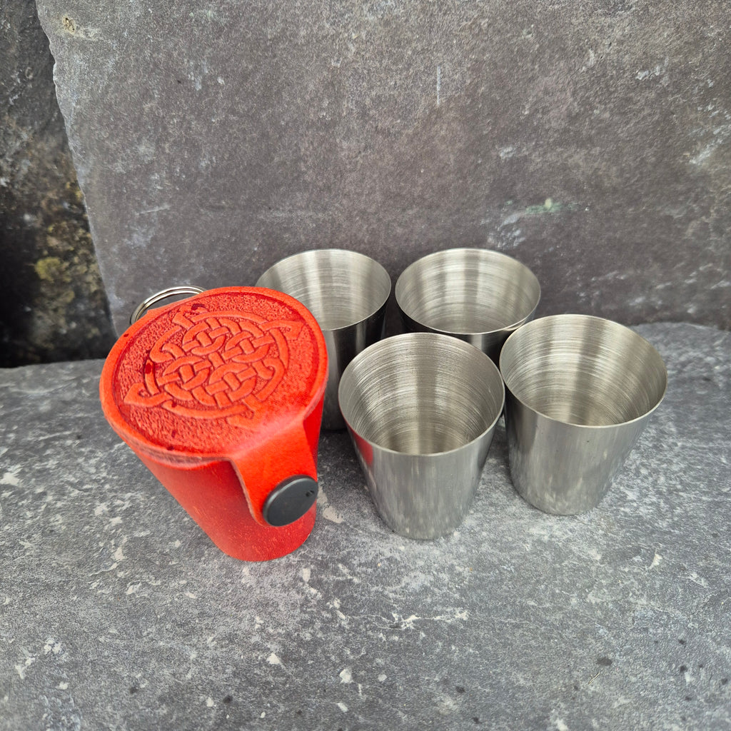 The Leather case is 5.5cm tall, cups hold 30ml each. ( See photo of yellow set for scale)