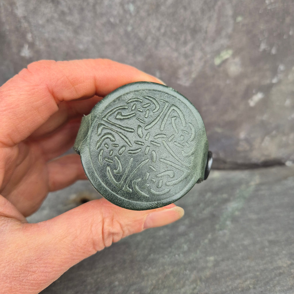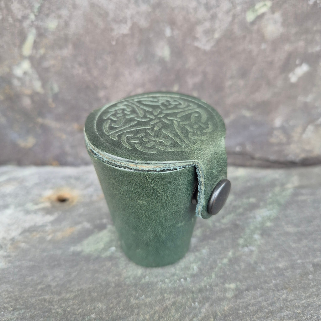 The Leather case is 5.5cm tall, cups hold 30ml each, and the keyfob is fitted with press studs to attach the case to a belt, bag etc.