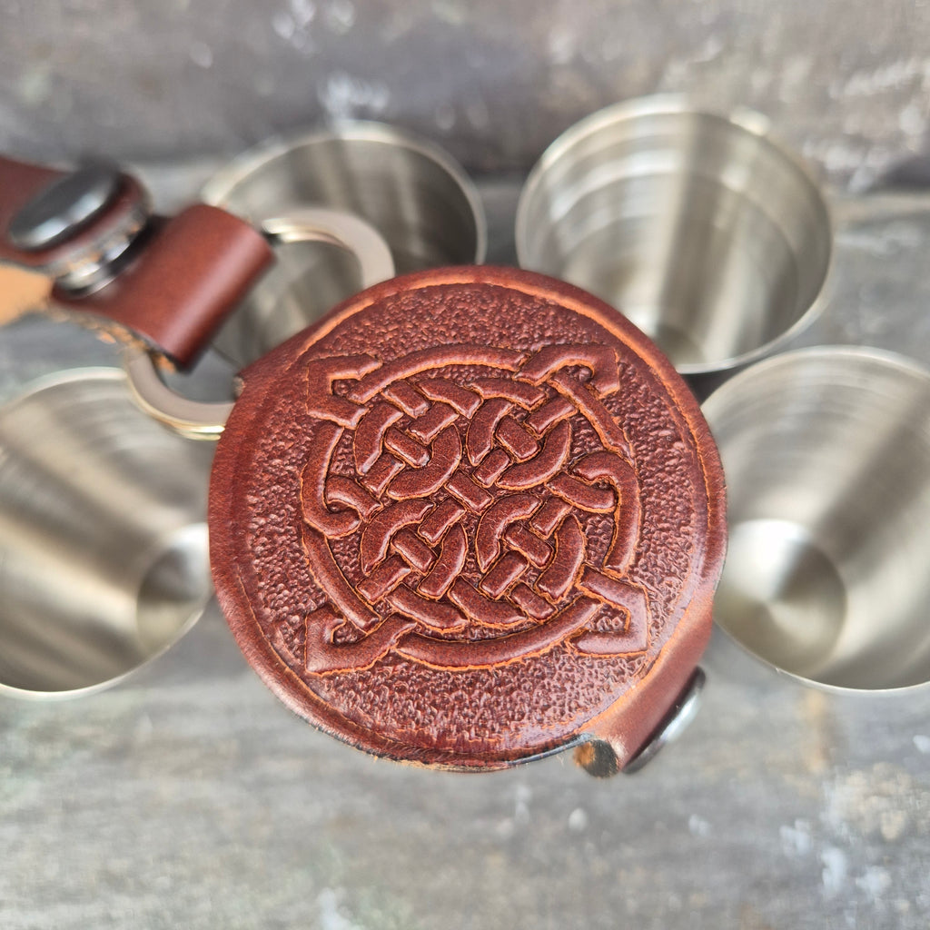 Leather case containing 4 nested stainless steel dram glasses with a matching keyfob