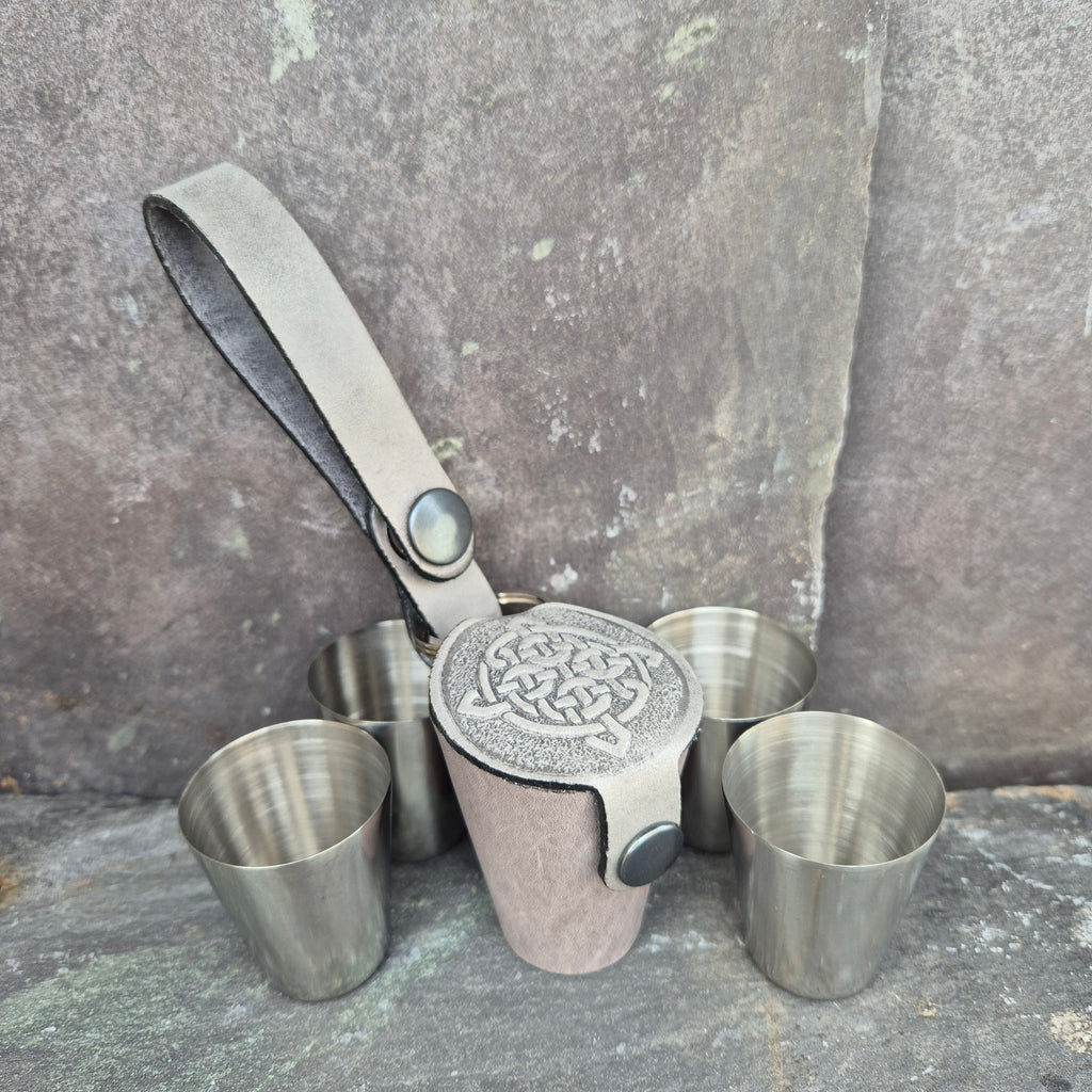 Leather case containing 4 nested stainless steel dram glasses with a matching keyfob