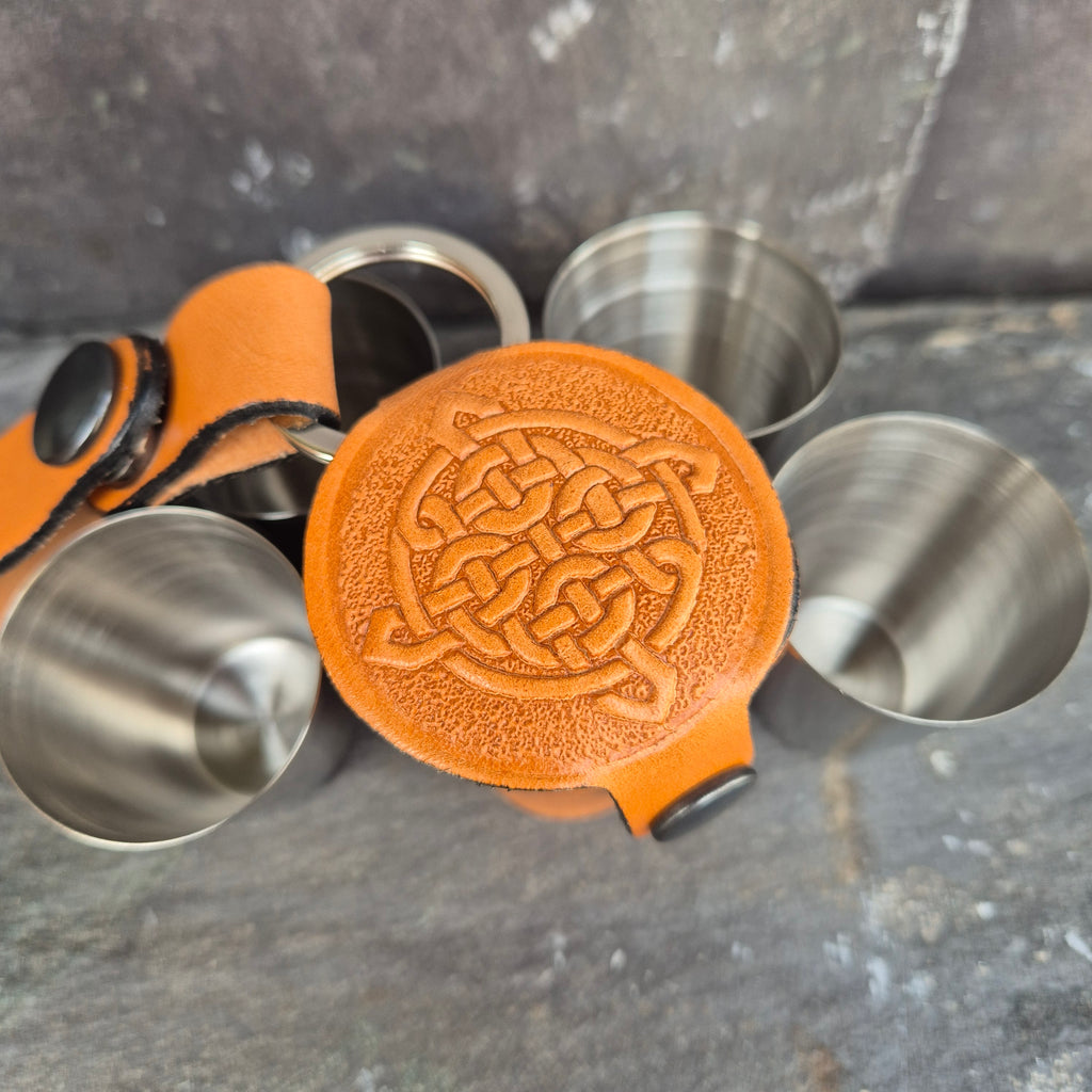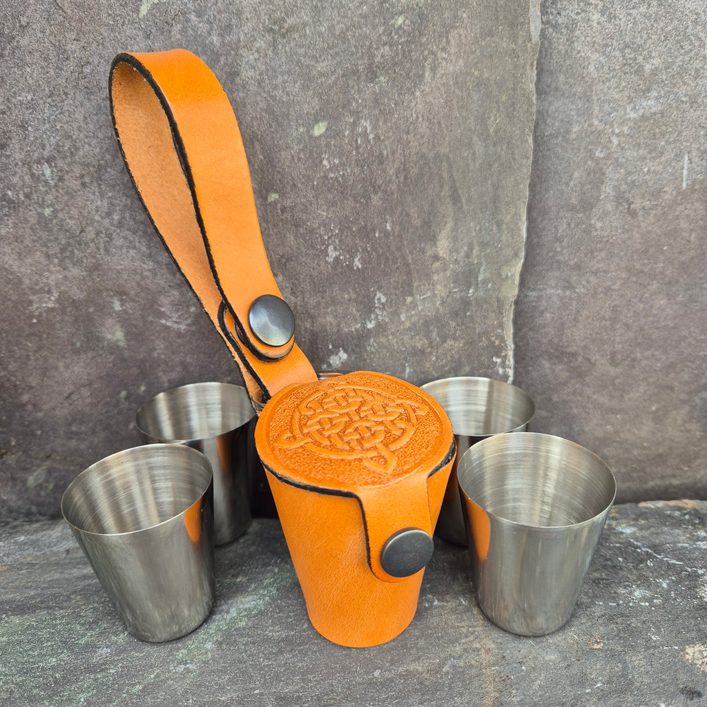Leather case containing 4 nested stainless steel dram glasses with a matching keyfob